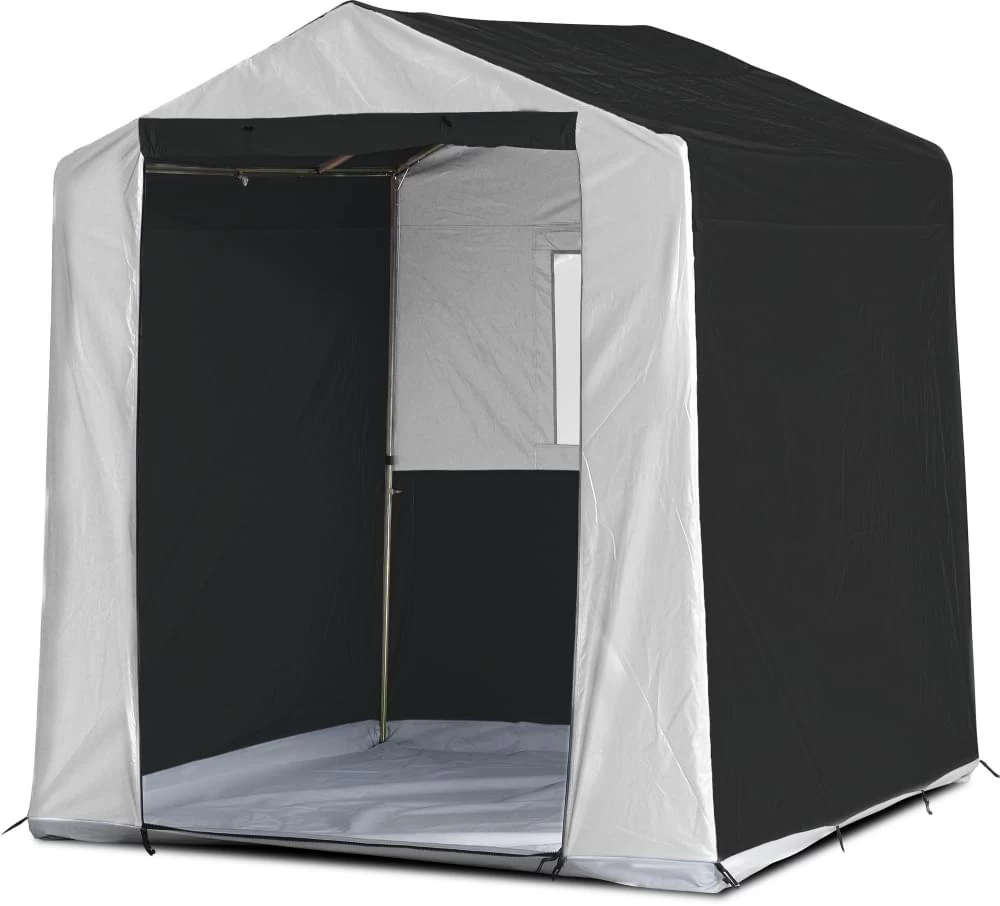De schuurtent voorkomt condensvorming vanwege de goede ventilatie in de nok. Daarnaast zit er aan de achterkant een horraam dat ook voor luchtcirculatie zorgt. De Bolero Schuurtent heeft een stevig verzinkt stalen 22/19 mm frame en een kuipgrondzeil en dak gemaakt van PVC.