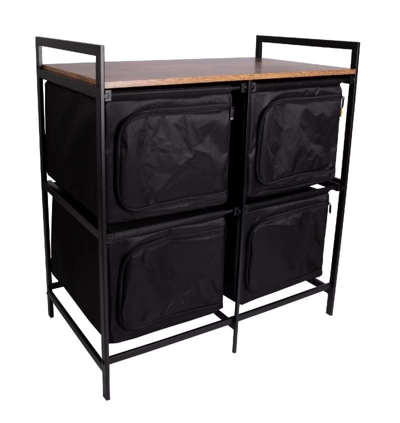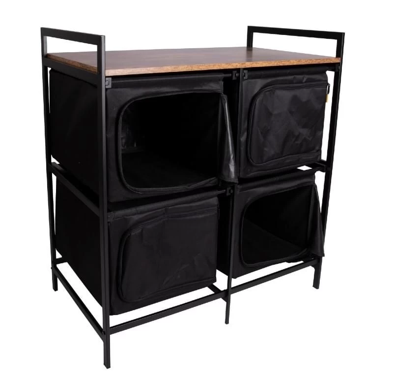Stijlvolle kookkast en/of opbergkast met een industriële look. De Lawton campingkast van Bo-Camp heeft een stevig zwart stalen frame en een houtlook blad van MDF. De kast heeft 4 opbergvakken die met een rits af te sluiten zijn. Deze robuuste campingkast is ideaal als opbergruimte voor in de (voor)tent.