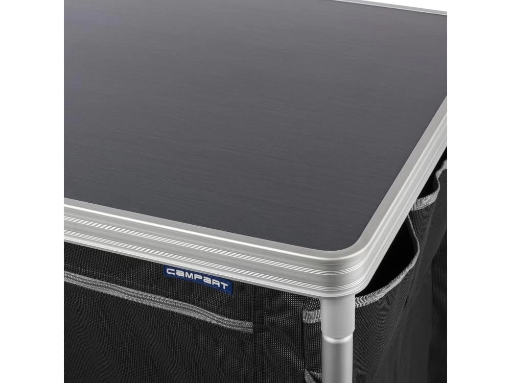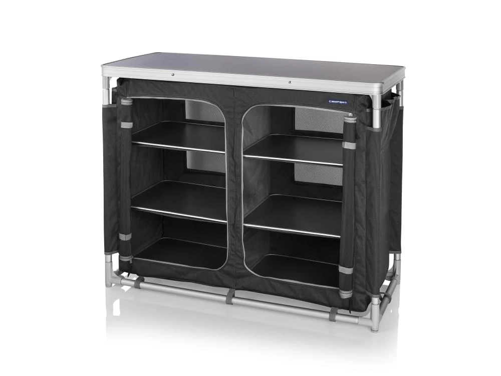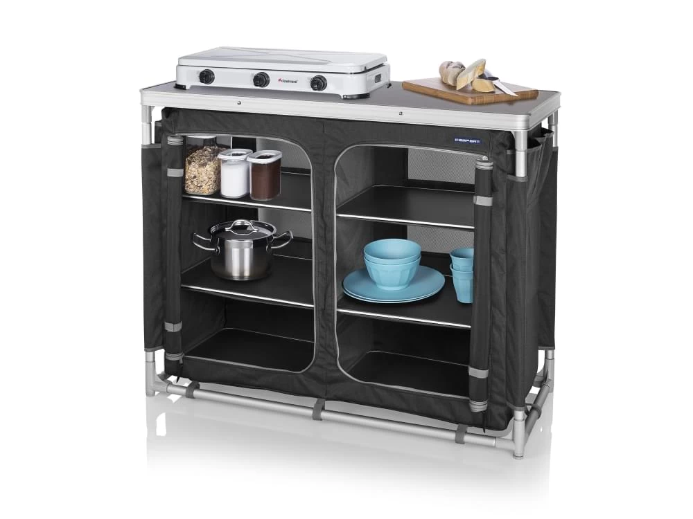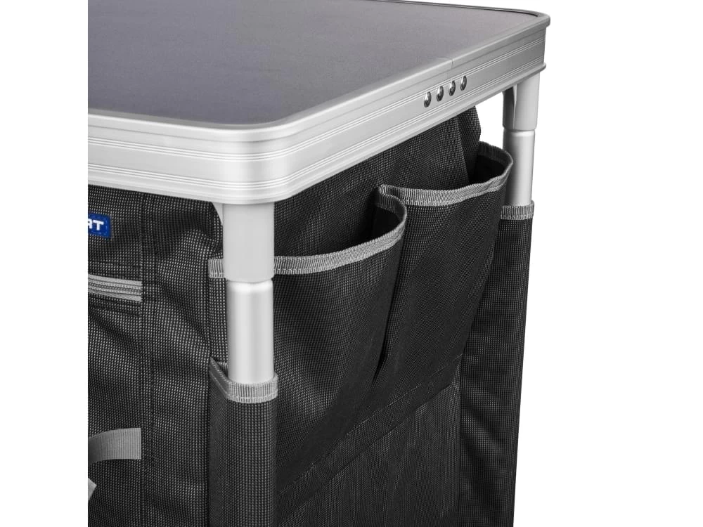 De campingkeuken Madrid is solide en makkelijk in gebruik. Door de twee vakken met ieders drie planken kan je hier lekker veel spullen in kwijt. Aan de zijkant zitten ook handige steekzakken om de wat kleinere spullen in op te bergen.