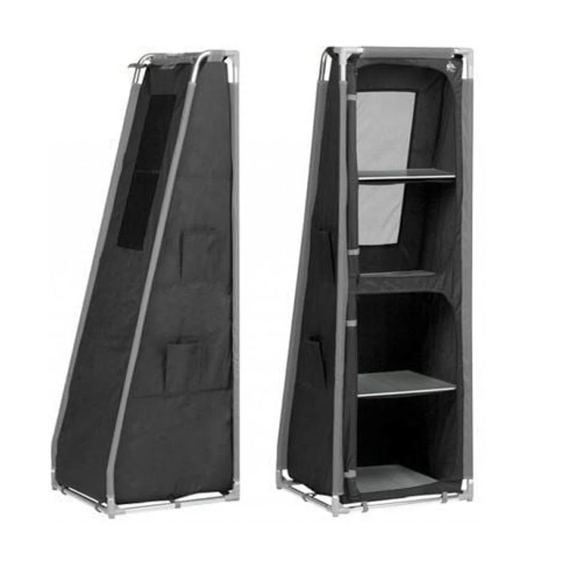 De campingkast heeft 4 aparte vakken met inlegbladen voor extra stevigheid. Dankzij de verstelbare pootjes is de kast ook op ongelijke grond toch recht te zetten. Het stevige frame is eenvoudige uit elkaar te halen waarna het geheel kan worden opgeborgen in de bijgeleverde draagtas.