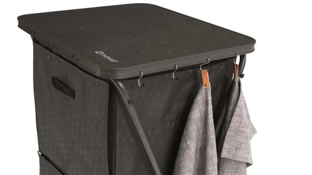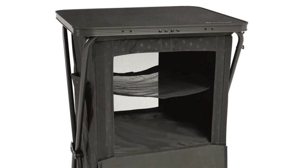 De campingkast heeft drie uitneembare planken waarvan twee grote massieve planken met een draagvermogen tot 10 kg per plank, en een gaasplank bovenin met een draagvermogen tot 5 kg. Verder zit aan de zijkant van de kast een klein opberg vak waar je bijvoorbeeld je bril of wat zonnebrand in kwijt kan. De ophanghaken aan de zijkant bieden plaats voor een handdoek of theedoek. Voor nog meer opbergruimte zijn er ook bevestigingspunten gemaakt aan de zijkant voor de Neat’N’Tidy organisator M (optioneel verkrijgbaar).